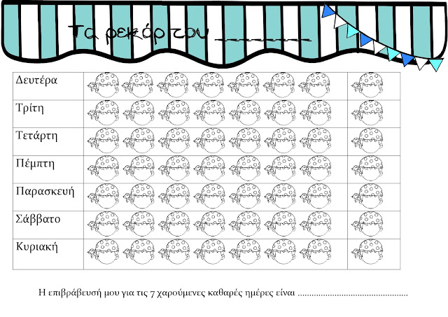 Θα δείτε πως ένα ετοιμάσει 2 πίνακες, ξεχωριστά για αγοράκια και για κοριτσάκια. Διαλέγετε τον πίνακα ανάλογα με το φύλο του παιδιού σας. Καλό θα είναι να πλαστικοποιήσετε τον πίνακα ώστε να σημειώνετε επάνω με μαρκαδόρο και στο τέλος της εβδομάδας να το σβήνετε, οπότε θα είναι έτοιμο για χρήση ξανά .