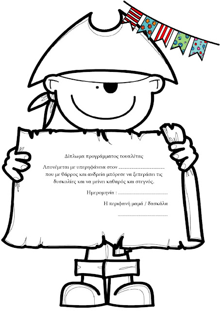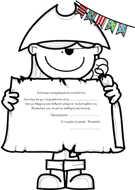 Τέλος, για να θυμάστε τη στιγμή που «καθαρίσατε», σας έχω ετοιμάσει ένα δίπλωμα/ βεβαίωση επιτυχίας για το πρόγραμμα τουαλέτας. Μπορείτε να το εκτυπώσετε, να το ζωγραφίσετε και να γράψετε τα στοιχεία σας.