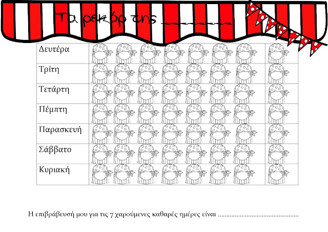 Η πρώτη αριστερή στήλη έχει τις ημέρες τις εβδομάδας, στη μεσαία φατσούλες από πειρατές και στην τελευταία μόνο μία φατσούλα. Στο τέλος της σελίδα υπάρχει μία πρόταση η οποία αποτελεί την υπενθύμιση της ανταμοιβής. Ο αριθμός από τις φατσούλες είναι 7, τόσο έχω υπολογίσει πως πάμε με τον γιο μου τουαλέτα. Αν δεν συμφωνείτε με τον αριθμό μπορεί να τις αφαιρέσετε.
